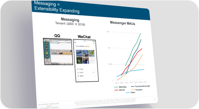 Messaging = Extensibility Expanding Messaging Messenger MAUs Tencent (2000 2018) 1.5B QQ WeChat 1.0B 0.5B 0 2011 2012 2013 2014 2015 2016 2017 WhatsApp Facebook Messenger WeChat Instagram Twitter Source: Facebook, WhatsApp, Tencent, Instagram, Twitter, Morgan Stanley Research. Note: 2013 data for Instagram & Facebook Messenger are approximated from statements made in early 2014. Twitter users excludes SMS fast followers. 22 MAUs (Monthly Active Users) are defined as users who log into a messenger on the web or through an application.