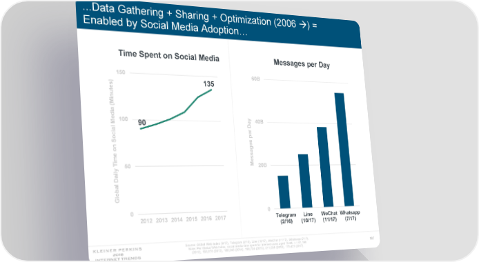 ...Data Gathering + Sharing + Optimization (2006 ) = Enabled by Social Media Adoption… Time Spent on Social Media Messages per Day 150 60B ) 135 inutes (M dia e 100 40B M 90 l Day r ia pe oc s ge on S a s s e ime T M 50 20B ly Dai obal Gl 0 0 2012 2013 2014 2015 2016 2017 Telegram Line WeChat Whatsapp (2/16) (10/17) (11/17) (7/17) Source: Global Web Index (9/17), Telegram (2/16), Line (10/17), WeChat (11/17), Whatsapp (7/17). Note: Per Global Web Index, social media time spent for Internet users aged 16-64. n = 61,196 187 (2012), 156,876 (2013), 168,046 (2014), 198,734 (2015), 211,024 (2016), 178,421 (2017).