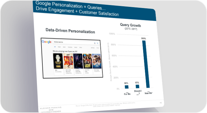 Google Personalization = Queries… Drive Engagement + Customer Satisfaction Query Growth (2015 -2017) Data-Driven Personalization 1000% 900% 800% 2017) - 15 20 ( al 600% lob G , h t w o r G 400% y er u Q le g o 200% o G 65% 60% 0% __ Should I __ For Me __? Near Me* Source: Google (5/18). Note: Google queries only personalized for geo-location data. *Reflects mobile queries, where location data is readily available / important. 192