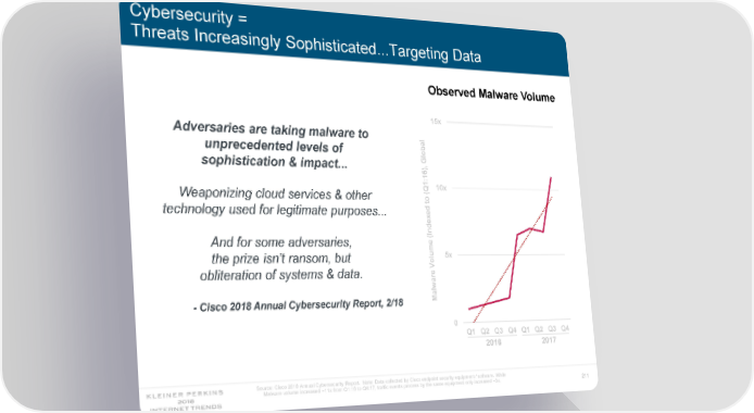Cybersecurity = Threats Increasingly Sophisticated...Targeting Data Observed Malware Volume 15x Adversaries are taking malware to al unprecedented levels of ob l G sophistication & impact... 1:16), 10x Q ( Weaponizing cloud services & other o t ed technology used for legitimate purposes... ex nd I ( And for some adversaries, 5x the prize isn’t ransom, but olume V e obliteration of systems & data. ar w al M - Cisco 2018 Annual Cybersecurity Report, 2/18 0 Q1 Q2 Q3 Q4 Q1 Q2 Q3 Q4 2016 2017 Source: Cisco 2018 Annual Cybersecurity Report. Note: Data collected by Cisco endpoint security equipment / software. While Malware volume increased ~11x from Q1:16 to Q4:17, traffic events process by the same equipment only increased ~3x. 211