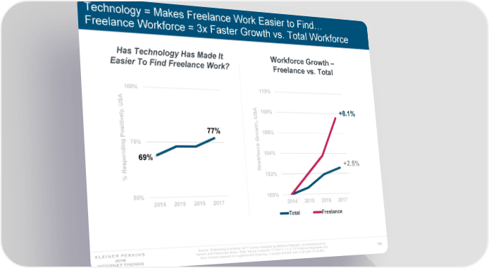 Technology = Makes Freelance Work Easier to Find… Freelance Workforce = 3x Faster Growth vs. Total Workforce Has Technology Has Made It Workforce Growth – Easier To Find Freelance Work? Freelance vs. Total 100% 110% USA , 108% +8.1% ly USA e th, itiv os 77% 106% ow r P G 75% e ing rc 104% fo 69% pond ork +2.5% W Res 102% % 50% 100% 2014 2015 2016 2017 2014 2015 2016 2017 Total Freelance Source: ‘Freelancing in America: 2017’ survey conducted by Edelman Research, co-commissioned by Upwork and Freelancers Union. Note: Survey conducted 7/17-8/17, n = 2,173 Freelance Employees who 163 have received payment for supplemental temporary, or project-oriented work in the past 12 months.