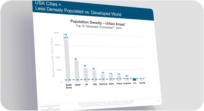 USA Cities = Less Densely Populated vs. Developed World Population Density – Urban Areas* Top 10 ‘Advanced’ Economies**, 2014 4000 17x USA ) s a re A 3000 n rba (U 2 2000 9x r KM pe s 6x nt 5x 1000 ide ~3x ~3x ~2x Res ~2x 0 South Japan UK Italy Germany Spain France Australia USA Canada USA Korea Source: OECD, International Monetary Fund (IMF). *Urban areas defined as “Functional Urban Areas’ per OECD/EU with greater than 500K residents. **IMF determines ‘Advanced Economies’ designation using a 118 combination of GDP per Capita, Export Diversity, and integration into the global financial system.