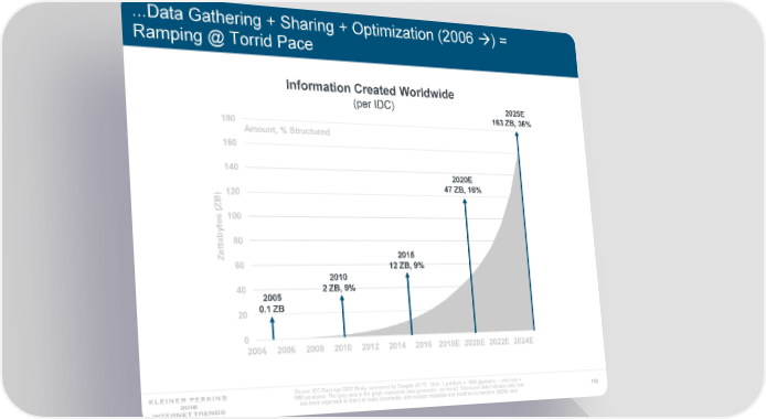 ...Data Gathering + Sharing + Optimization (2006 ) = Ramping @ Torrid Pace Information Created Worldwide (per IDC) 2025E 163ZB, 36% 180 Amount, % Structured 160 140 2020E 47 ZB, 16% 120 B) (Z 100 tes by a 80 tt Ze 2015 60 12 ZB, 9% 2010 40 2 ZB, 9% 2005 0.1 ZB 20 0 2004 2006 2008 2010 2012 2014 2016 2018E 2020E 2022E 2024E Source: IDC Data Age 2025 Study, sponsored by Seagate (4/17). Note: 1 petabyte = 1MM gigabytes, 1 zeta byte = 1MM petabytes. The grey area in the graph represents data generated, not stored. Structured data indicates data that 189 has been organized so that it is easily searchable and includes metadata and machine-to-machine (M2M) data.