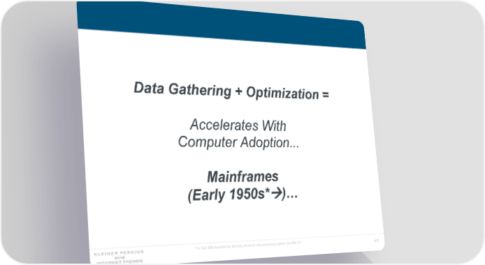 Internet Trends 2018 Page 176 Page 178Data Gathering + Optimization = Accelerates With Computer Adoption... Mainframes (Early 1950s*)… * In 1952 IBM launched the first fully electronic data processing system, the IBM 701. 177