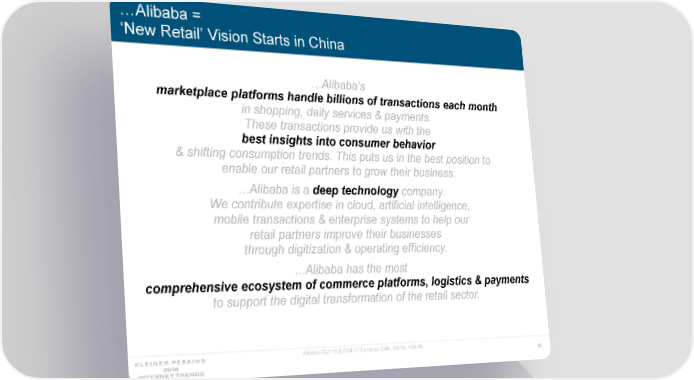 …Alibaba = ‘New Retail’ Vision Starts in China …Alibaba’s marketplace platforms handle billions of transactions each month in shopping, daily services & payments. These transactions provide us with the best insights into consumer behavior & shifting consumption trends. This puts us in the best position to enable our retail partners to grow their business. …Alibaba is a deep technology company. We contribute expertise in cloud, artificial intelligence, mobile transactions & enterprise systems to help our retail partners improve their businesses through digitization & operating efficiency. …Alibaba has the most comprehensive ecosystem of commerce platforms, logistics & payments to support the digital transformation of the retail sector. Alibaba CQ1:18 & CQ4:17 Earnings Calls, 5/4/18, 1/24/18. 93