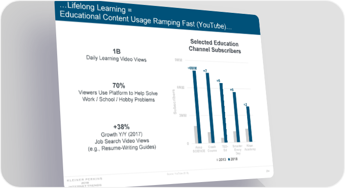 …Lifelong Learning = Educational Content Usage Ramping Fast (YouTube)… Selected Education Channel Subscribers 1B 9MM Daily Learning Video Views +6MM +7 +6 70% 6MM +6 Viewers Use Platform to Help Solve ers Work / School / Hobby Problems crib +2 Subs 3MM +38% Growth Y/Y (2017) Job Search Video Views 0 (e.g., Resume-Writing Guides) Asap Crash TED- Smarter Khan SCIENCE Course Ed Every Academy Day 2013 2018 Source: YouTube (5/18). 234