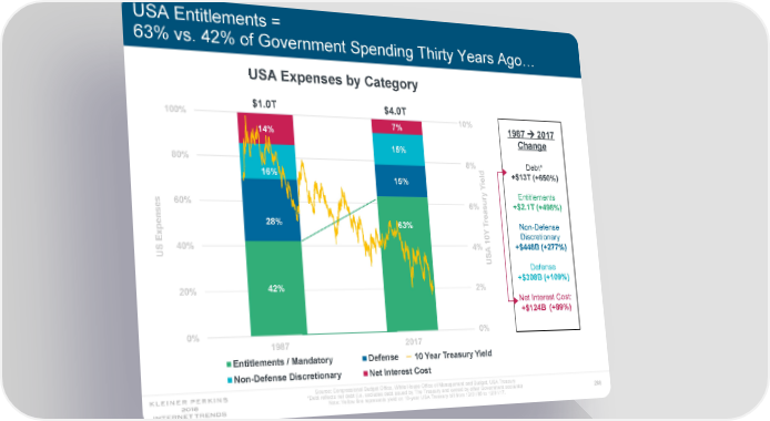 USA Entitlements = 63% vs. 42% of Government Spending Thirty Years Ago… USA Expenses by Category $1.0T $4.0T 100% 10% 7% 1987 2017 14% Change 15% 80% 8% Debt* ld +$13T (+650%) 16% ie 15% Y Entitlements s ury 60% 6% s +$2.1T (+498%) e a ns re 28% T 63% Non-Defense pe x Y 0 Discretionary E 1 40% 4% +$448B (+277%) US USA Defense +$308B (+109%) 42% 20% 2% Net Interest Cost: +$124B (+89%) 0% 0% 1987 2017 Entitlements / Mandatory Defense 10 Year Treasury Yield Non-Defense Discretionary Net Interest Cost Source: Congressional Budget Office, White House Office of Management and Budget, USA Treasury *Debt reflects net debt (i.e. excludes debt issued by The Treasury and owned by other Government accounts) 286 Note: Yellow line represents yield on 10-year USA Treasury bill from 12/31/86 to 12/31/17.