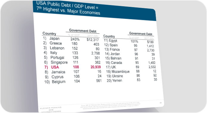 USA Public Debt / GDP Level = th 7 Highest vs. Major Economies Government Debt Government Debt Country % of GDP 2017 ($B) Country % of GDP 2017 ($B) 1) Japan 240% $12,317 11) Egypt 101% $199 2) Greece 180 403 12) Spain 99 1,412 3) Lebanon 152 80 13) France 97 2,730 4) Italy 133 2,798 14) Jordan 96 39 5) Portugal 126 301 15) Bahrain 91 31 6) Singapore 111 362 16) Canada 90 1,482 7) USA 108 20,939 17) UK 89 2,532 8) Jamaica 107 16 18) Mozambique 88 12 9) Cyprus 106 24 19) Ukraine 86 92 10) Belgium 104 561 20) Yemen 83 30 Source: IMF 2017 Estimates Note: Ranking excludes countries with public debt less than $10B in 2015. Public debt includes federal, state and local government debt but excludes unfunded pension liabilities from government 284 defined-benefit pension plans and debt from public enterprises and central banks. FX rates as of 3/28/18.