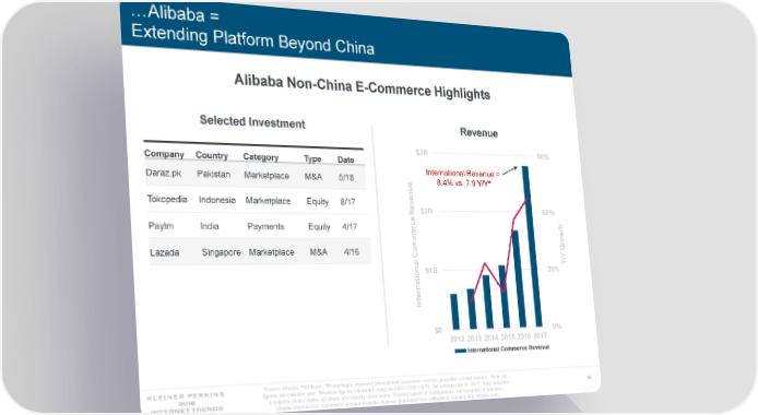 …Alibaba = Extending Platform Beyond China Alibaba Non-China E-Commerce Highlights Selected Investment Revenue $3B 90% Company Country Category Type Date International Revenue = Daraz.pk Pakistan Marketplace M&A 5/18 8.4% vs. 7.9 Y/Y* ue en Tokopedia Indonesia Marketplace Equity 8/17 ev R $2B 60% h Paytm India Payments Equity 4/17 t w ro ommerce G Lazada Singapore Marketplace M&A 4/16 C Y / al Y $1B 30% on nternati I $0 0% 2012 2013 2014 2015 2016 2017 International Commerce Revenue Source: Alibaba, Pitchbook. *Percentages represent international commerce revenue proportion of total revenue. Note: All figures are calendar year. Revenue figures translated using the USD / CNY = 6.76, the average rate for 2017. Grey indicates 94 a majority control stake, all others are minority investments. Country based on headquarters, not countries of operation. Alibaba International Commerce revenue includes revenue generated from AliExpress, Lazada, and Alibaba.com.