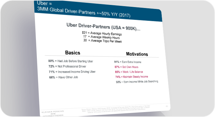 Uber = 3MM Global Driver-Partners +~50% Y/Y (2017) Uber Driver-Partners (USA = 900K)… $21 = Average Hourly Earnings 17 = Average Weekly Hours 30 = Average Trips Per Week Basics Motivations 80% =Had Job Before Starting Uber 91% =Earn Extra Income 72% =Not Professional Driver 87% =Set Own Hours 71% = Increased Income Driving Uber 85% = Work / Life Balance 66%= Have Other Job 74% =Maintain Steady Income 32% = Earn Income While Job Searching Source: Drivers + Basics = Hall & Krueger (2016) ‘An Analysis Of The Labor Market For Uber’s Driver-partners In The United States.’ Other = Cook, Diamond, Hall, List, & Oyer (2018) ‘The Gender Earning Gap in the Gig Economy’ Note: % Statistics 171 based on 12/14 survey of Uber Drivers in 20 markets that represent 85% of all USA Uber Driver-Partners