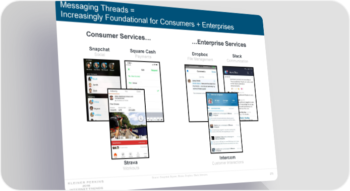 Messaging Threads = Increasingly Foundational for Consumers + Enterprises Consumer Services… …Enterprise Services Snapchat Square Cash Dropbox Slack Social Payments File Management Communication Intercom Strava Customer Interactions Workouts Source: Snapchat, Square, Strava, Dropbox, Slack, Intercom. 270