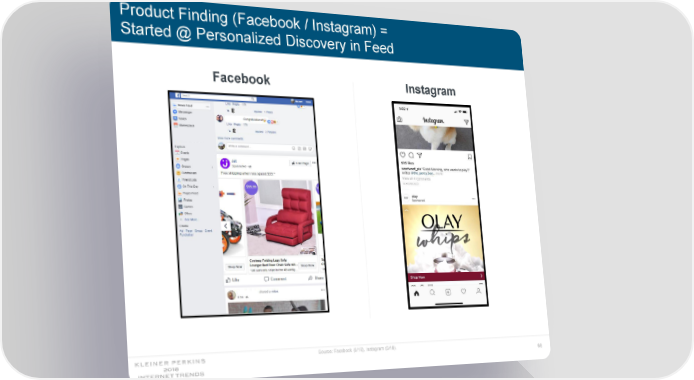 Internet Trends 2018 Page 65 Page 67Product Finding (Facebook / Instagram) = Started @ Personalized Discovery in Feed Facebook Instagram Source: Facebook (5/18), Instagram (5/18). 66