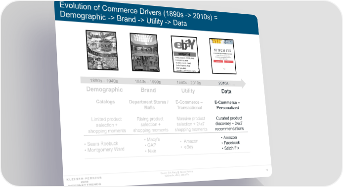 Evolution of Commerce Drivers (1890s -> 2010s) = Demographic -> Brand -> Utility -> Data 1890s - 1940s 1940s - 1990s 1990s - 2010s 2010s - … Demographic Brand Utility Data Catalogs DepartmentStores / E-Commerce – E-Commerce – Malls Transactional Personalized Limited product Rising product Massive product Curated product selection + selection + selection + 24x7 discovery + 24x7 shopping moments shoppingmoments shopping moments recommendations • Macy’s • Amazon • Sears Roebuck • Amazon • GAP • Facebook • MontgomeryWard • eBay • Nike • Stitch Fix Source: Eric Feng @ Kleiner Perkins Wikimedia, eBay, Stitch Fix. 79