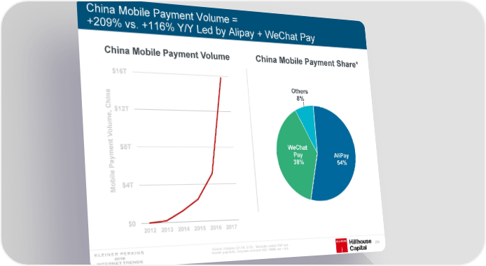China Mobile Payment Volume = +209% vs. +116% Y/Y Led by Alipay + WeChat Pay China Mobile Payment Volume China Mobile Payment Share* $16T Others a 8% n i h C $12T me, u l o V t $8T WeChat men Pay AliPay 38% 54% Pay e l i b o $4T M $0 2012 2013 2014 2015 2016 2017 Source: Analysys (Q1:18, 3/18). *Excludes certain P2P and 259 transfer payments. Assumes constant USD / RMB rate = 6.9.