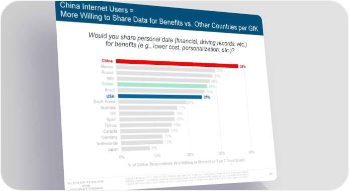 China Internet Users = More Willing to Share Data for Benefits vs. Other Countries per GfK Would you share personal data (financial, driving records, etc.) for benefits (e.g., lower cost, personalization, etc.)? China China 38% Mexico 30% Russia 29% Italy 28% Global Global 27% Brazil 26% USA 25% USA South Korea 20% Australia 17% UK 16% Spain 16% France 15% Canada 14% Germany 12% Netherlands 12% Japan 8% 0% 10% 20% 30% 40% % of Global Respondents Very Willing to Share (6 or 7 on 7 Point Scale) Source: GfK Survey (1/17). Note: n = 22K of internet users ages 15+. A scale of 1-7 were used to identify the level of agreement with the following statement: “I am willing to share my personal data (health, financial, driving records, energy use, etc.) in exchange for benefits or 223 rewards like lower costs or personalized service” – using a scale where “1” means “don’t agree at all” and “7” means “agree completely.” .