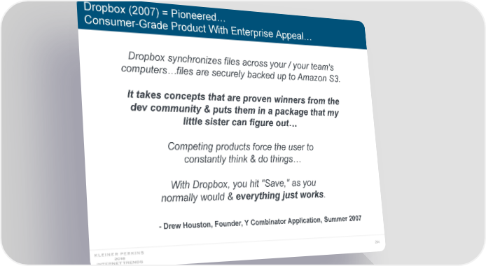 Dropbox (2007) = Pioneered… Consumer-Grade Product With Enterprise Appeal… Dropbox synchronizes files across your / your team's computers…files are securely backed up to Amazon S3. It takes concepts that are proven winners from the dev community & puts them in a package that my little sister can figure out… Competing products force the user to constantly think & do things… With Dropbox, you hit "Save," as you normally would & everything just works. - Drew Houston, Founder, Y Combinator Application, Summer 2007 264