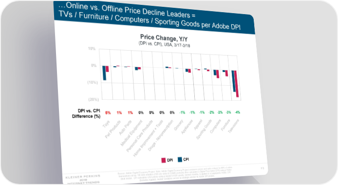 …Online vs. Offline Price Decline Leaders = TVs / Furniture / Computers / Sporting Goods per Adobe DPI Price Change, Y/Y (DPI vs. CPI), USA, 3/17-3/18 10% 0% (10%) (20%) DPI vs. CPI 5% 1% 1% 0% 0% 0% 0% -1% -1% -1% -2% -2% -3% -4% Difference (%) (30%) DPI CPI Source: Adobe Digital Economy Project Note: Adobe Digital Economy Project measures prices and sales volume for 80% of online transactions at top 100 USA retailers (15B site visits & 2.2MM products) then calculates a Digital Price Index (DPI) using a Fisher 113 Ideal model. CPI calculates USA prices using a basket of 83K goods, tracked monthly, & applied to a Laspeyeres model. DPI Excludes Apparel. Austan Goolsbee serves as strategic advisor to Adobe DPI project.