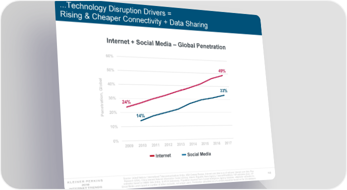 ...Technology Disruption Drivers = Rising & Cheaper Connectivity + Data Sharing Internet + Social Media – Global Penetration 60% 49% 50% 40% obal 33% Gl 30% 24% tration, ne e 20% P 14% 10% 0% 2009 2010 2011 2012 2013 2014 2015 2016 2017 Internet Social Media Source: United Nations / International Telecommunications Union, USA Census Bureau. Internet user data is as of mid-year Internet user data: Pew Research (USA), China Internet Network Information Center (China), Islamic Republic News Agency / InternetWorldStats / KP estimates (Iran), KP 146 estimates based on IAMAI data (India), & APJII (Indonesia). Population sourced from Central Intelligence Agency database. eMarketer estimates for Social Media users based on number of active accounts, not unique users. Penetration calculated as a % of total population based on the CIA database.