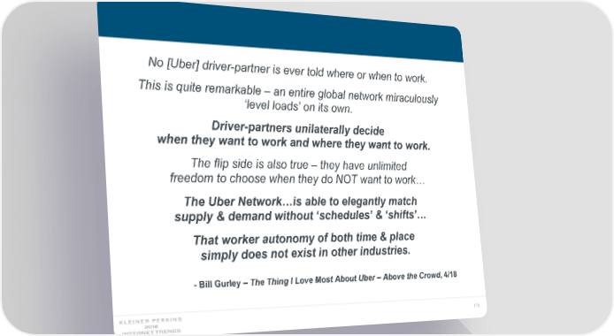 No [Uber] driver-partner is ever told where or when to work. This is quite remarkable – an entire global network miraculously ‘level loads’ on its own. Driver-partners unilaterally decide when they want to work and where they want to work. The flip side is also true – they have unlimited freedom to choose when they do NOT want to work… The Uber Network…is able to elegantly match supply & demand without ‘schedules’ & ‘shifts’… That worker autonomy of both time & place simply does not exist in other industries. - Bill Gurley – The Thing I Love Most About Uber – Above the Crowd, 4/18 174
