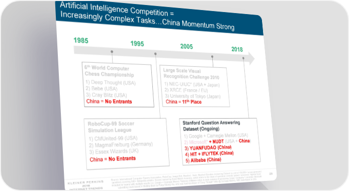 Artificial Intelligence Competition = Increasingly Complex Tasks…China Momentum Strong 1985 1995 2005 2018 th 6 World Computer Large Scale Visual Chess Championship Recognition Challenge 2010 1) Deep Thought (USA) 1) NEC-UIUC* (USA + Japan) 2) Bebe (USA) 2) XRCE (France / EU) 3) Cray Blitz (USA) 3) University of Tokyo (Japan) th China = No Entrants China = 11 Place RoboCup-99 Soccer Stanford Question Answering Simulation League Dataset (Ongoing) 1) Google + Carnegie Mellon (USA) 1) CMUnited-99 (USA) 2) Microsoft* + NUDT (USA + China) 2) MagmaFreiburg (Germany) 3) YUANFUDAO (China) 3) Essex Wizards (UK) 4) HIT + iFLYTEK (China) China = No Entrants 5) Alibaba (China) Source: International Computer Games Association, RoboCup, Image-Net, Stanford. Note: Stanford Question Answering Dataset is a set of 100,000+ human-generated questions covering 500+ Wikipedia articles. Scores ranked by Exact Match Accuracy, which refers to the share of questions correctly parsed / answered. Highest Score 226 included for teams with multiple results (i.e. Google + Carnegie Melon) *National Affiliation refers to main campus of sponsoring Group / Company / University. Microsoft submitting team based in Beijing (lead by Feng-Hslung Hsu who was lead developer of ‘Deep Thought’ while @ Carnegie Mellon). NEC team based in USA.