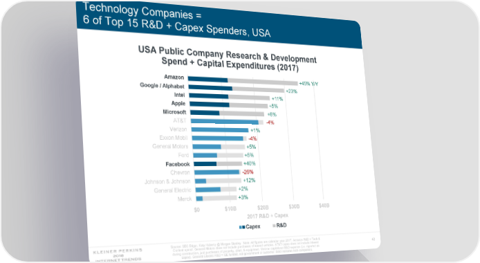 Technology Companies = 6 of Top 15 R&D + Capex Spenders, USA USA Public Company Research & Development Spend + Capital Expenditures (2017) Amazon Amazon +45% Y/Y Google / Alphabet Google / Alphabet +23% Intel Intel +11% Apple +5% Apple Microsoft Microsoft +6% AT&T -4% Verizon +1% Exxon Mobil -4% General Motors +5% Ford +5% Facebook +40% Facebook Chevron -26% Johnson & Johnson +12% General Electric +2% Merck +3% $0 $10B $20B $30B $40B 2017 R&D + Capex Capex R&D Source: SEC Edgar, Katy Huberty @ Morgan Stanley. Note: All figures are calendar year 2017. Amazon R&D = Tech & Content spend. General Motors does not include purchases of leased vehicles. AT&T capex does not include interest 40 during construction, just purchases of property, plant, & equipment. Verizon capitalizes R&D expense (i.e. reported as capex). General Electric R&D = GE funded, not government or customer. Bold indicates tech companies.