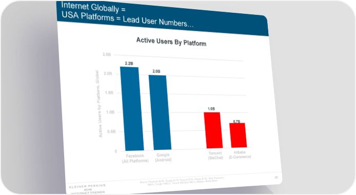 Internet Globally = USA Platforms = Lead User Numbers… Active Users By Platform 2.5B 2.2B 2.0B 2.0B obal Gl orm,1.5B tf la P by 1.0B 1.0B rs Use 0.7B e tiv 0.5B c A 0 Facebook Google Tencent Alibaba (All Platforms) (Android) (WeChat) (E-Commerce) Source: Facebook (4/18), Google (5/17), Tencent (3/18), Alibaba (5/18). Note: Facebook = MAUs, Google = MAUs, Tencent WeChat = MAUs, Alibaba = Mobile MAUs. 220