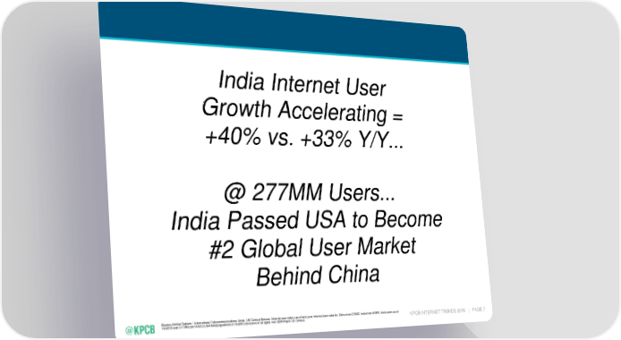 India Internet User Growth Accelerating = +40% vs. +33% Y/Y... @ 277MM Users... India Passed USA to Become #2 Global User Market Behind China Source: United Nations / International Telecommunications Union, US Census Bureau. Internet user data is as of mid-year. Internet user data for: China from CNNIC, India from IAMAI. India users as of 10/2015 was 317MM per IAMAI; USA total population at 12/2015 (inclusive of all ages) was 323MM per US Census. KPCB INTERNET TRENDS 2016 | PAGE 7