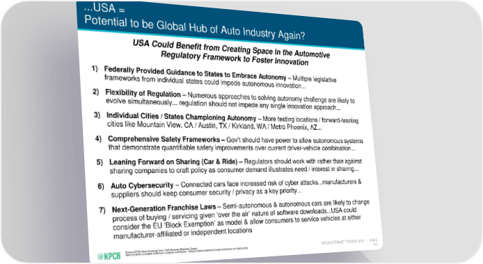 ...USA = Potential to be Global Hub of Auto Industry Again? USA Could Benefit from Creating Space in the Automotive Regulatory Framework to Foster Innovation 1) Federally Provided Guidance to States to Embrace Autonomy – Multiple legislative frameworks from individual states could impede autonomous innovation... 2) Flexibility of Regulation – Numerous approaches to solving autonomy challenge are likely to evolve simultaneously... regulation should not impede any single innovation approach... 3) Individual Cities / States Championing Autonomy – More testing locations / forward-leaning cities like Mountain View, CA / Austin, TX / Kirkland, WA / Metro Phoenix, AZ... 4) Comprehensive Safety Frameworks – Gov’t should have power to allow autonomous systems that demonstrate quantifiable safety improvements over current driver-vehicle combination... 5) Leaning Forward on Sharing (Car & Ride) – Regulators should work with rather than against sharing companies to craft policy as consumer demand illustrates need / interest in sharing... 6) Auto Cybersecurity – Connected cars face increased risk of cyber attacks...manufacturers & suppliers should keep consumer security / privacy as a key priority... 7) Next-Generation Franchise Laws – Semi-autonomous & autonomous cars are likely to change process of buying / servicing given ‘over the air’ nature of software downloads...USA could consider the EU ‘Block Exemption’ as model & allow consumers to service vehicles at either manufacturer-affiliated or independent locations Source: KPCB Green Investing Team, Reilly Brennan (Stanford), Google Note: EU Block Exemption details per European Commission. Testing locations represent Google autonomous car testing cities. KPCB INTERNET TRENDS 2016 | PAGE 148