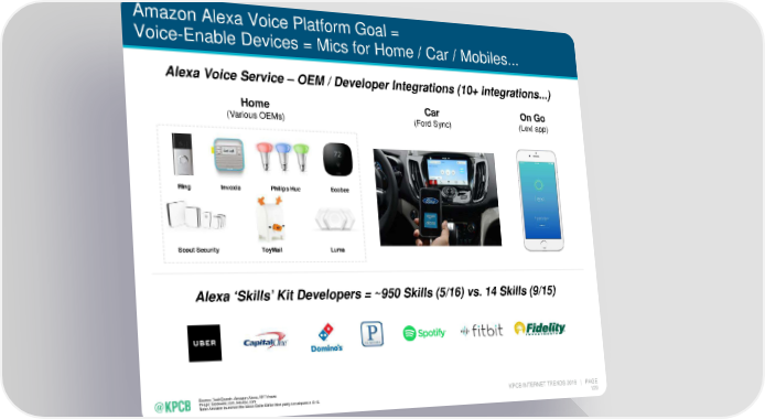 Amazon Alexa Voice Platform Goal = Voice-Enable Devices = Mics for Home / Car / Mobiles... Alexa Voice Service – OEM / Developer Integrations (10+ integrations...) Home Car On Go (Various OEMs) (Ford Sync) (Lexi app) Ring Invoxia Philips Hue Ecobee Scout Security ToyMail Luma Alexa ‘Skills’ Kit Developers = ~950 Skills (5/16) vs. 14 Skills (9/15) Source: TechCrunch, Amazon Alexa, AFTVnews Image: Geekwire.com, Heylexi.com KPCB INTERNET TRENDS 2016 | PAGE Note: Amazon launched the Alexa Skills Kit for third-party developers in 6/15. 129