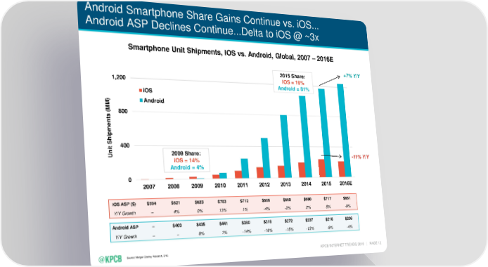 Android Smartphone Share Gains Continue vs. iOS... Android ASP Declines Continue...Delta to iOS @ ~3x Smartphone Unit Shipments, iOS vs. Android, Global, 2007 – 2016E 2015 Share: +7% Y/Y 1,200 iOS = 16% Android = 81% iOS Android (MM)800 ts n e m p i h S 400 t i n 2009 Share: U iOS = 14% -11% Y/Y Android = 4% 0 2007 2008 2009 2010 2011 2012 2013 2014 2015 2016E iOS ASP ($) $594 $621 $623 $703 $712 $686 $669 $680 $717 $651 Y/Y Growth – 4% 0% 13% 1% -4% -2% 2% 5% -9% Android ASP – $403 $435 $441 $380 $318 $272 $237 $216 $208 Y/Y Growth – – 8% 1% -14% -16% -15% -13% -8% -4% Source: Morgan Stanley Research, 5/16. KPCB INTERNET TRENDS 2016 | PAGE 12