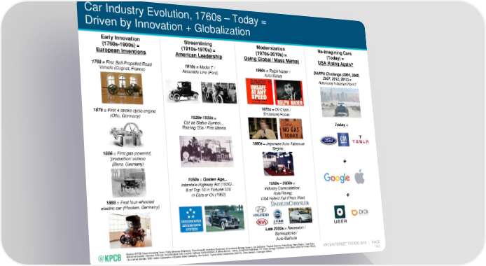 Car Industry Evolution, 1760s – Today = Driven by Innovation + Globalization Early Innovation Streamlining Modernization Re-Imagining Cars (1760s-1900s) = (1910s-1970s) = (1970s-2010s) = (Today) = European Inventions American Leadership Going Global / Mass Market USA Rising Again? 1768 = First Self-Propelled Road 1910s = Model T / 1960s = Ralph Nader / DARPA Challenge (2004, 2005, Vehicle (Cugnot, France) Assembly Line (Ford) Auto Safety 2007, 2012, 2013) = Autonomy Inflection Point? 1970s = Oil Crisis / 1876 = First 4-stroke cycle engine Emissions Focus (Otto, Germany) 1920s-1930s = Today = Car as Status Symbol... Roaring ‘20s / First Motels \ 1980s = Japanese Auto Takeover Begins... 1886 = First gas-powered, ‘production’ vehicle + (Benz, Germany) 1950s = Golden Age... Interstate Highway Act (1956)... 1990s – 2000s = 8 of Top 10 in Fortune 500 Industry Consolidation; in Cars or Oil (1960) Asia Rising; + 1888 = First four-wheeled USA Hybrid Fail (Prius Rise) electric car (Flocken, Germany) ? Late 2000s = Recession / Bankruptcies / Auto Bailouts Source: KPCB Green Investing Team, Reilly Brennan (Stanford), Piero Scaruffi, Inventors.About.com, International Energy Agency, Joe DeSousa, Popular Science, Franz Haag, Harry Shipler / Utah State Historical Society, National Archives, texasescapes.com, Federal Highway Administration, Matthew Brown, Forbes, Grossman Publishers, NY Times, Energy Transition, UVA Miller Center for Public Affairs, KPCB INTERNET TRENDS 2016 | PAGE The Detroit Bureau, SAIC Motor Corporation, Hyundai Motor Company, Kia Motors, Toyota Motor Corporation, DARPA, Chris Urmson / Carnegie Mellon, 143