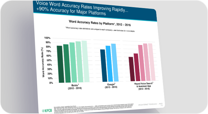 Voice Word Accuracy Rates Improving Rapidly... +90% Accuracy for Major Platforms Word Accuracy Rates by Platform*, 2012 – 2016 *Word accuracy rate definitions are unique to each company...see footnotes for more details 100% 90% 80% ) % ( 70% e at 60% R acy 50% r 40% ccu A 30% d r 20% o W 10% 0% Baidu1 Google2 Hound Voice Search3 (2012 - 2016) (2013 - 2015) & Assistant App (2012 - 2016) Source: Baidu, Google, VentureBeat, SoundHound Note: *Word Error Rate (WER) definitions are specific to each company. Word accuracy rate = 1 - WER. (1) Data shown is word accuracy rate on Mandarin speech recognition on one of Baidu's speech tasks. Real world mobile phone speech data is very noisy and hard for humans to transcribe. A 3.5% WER is better than what most native speakers can accomplish on this task. WER across different KPCB INTERNET TRENDS 2016 | PAGE datasets and languages are generally not comparable. (2) Data as of 5/15 and refers to recognition accuracy for English language. Word error rate is evaluated using real world search data which is extremely diverse and more error prone than typical human dialogue. (3) Data as of 1/16 and refers to recognition accuracy for English language. Word accuracy rate based on data collected from 119 thousands of speakers and real world queries with noise and accents.