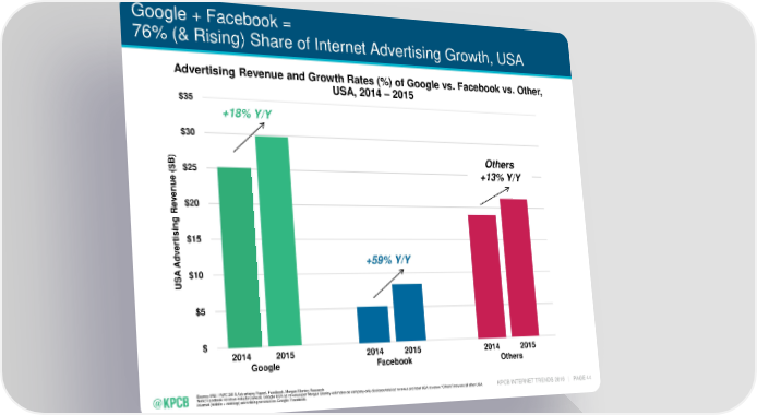 Google + Facebook = 76% (& Rising) Share of Internet Advertising Growth, USA Advertising Revenue and Growth Rates (%) of Google vs. Facebook vs. Other, USA, 2014 – 2015 35,000 $35 +18% Y/Y 30,000 $30 ) Others 25,000 $B $25 +13% Y/Y e ( u en 20,000 ev $20 R ng i s i 15,000 t $15 r e dv +59% Y/Y A 10,000 A $10 S U $5,000 $5 $0 $ 2014 2015 2014 2015 2014 2015 Google Facebook Others Source: IAB / PWC 2015 Advertising Report, Facebook, Morgan Stanley Research Note: Facebook revenue include Canada. Google USA ad revenue per Morgan Stanley estimates as company only discloses total ad revenue and total USA revenue. “Others” includes all other USA KPCB INTERNET TRENDS 2016 | PAGE 44 internet (mobile + desktop) advertising revenue ex-Google / Facebook.