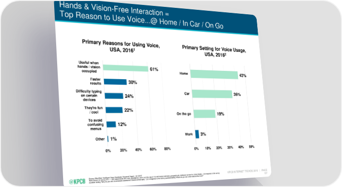 Hands & Vision-Free Interaction = Top Reason to Use Voice...@ Home / In Car / On Go Primary Reasons for Using Voice, Primary Setting for Voice Usage, 1 2 USA, 2016 USA, 2016 Useful when hands / vision 61% Home occupied 43% Faster 30% results Difficulty typing Car 36% on certain 24% devices They're fun 22% / cool On the go 19% To avoid confusing 12% menus Other 1% Work 3% 0% 20% 40% 60% 80% 0% 10% 20% 30% 40% 50% Source: MindMeld “Intelligent Voice Assistants Research Report – Q1 2016” Note: Based on survey of n = 1,800 respondents who were smartphone users over the age of 18, half female half male, geographically distributed across the United States. (1) In response to the survey KPCB INTERNET TRENDS 2016 | PAGE question stating “Why do you use voice/search commands? Check all that apply.” (2) In response to the survey question stating “Where do you use voice features the most?” 127