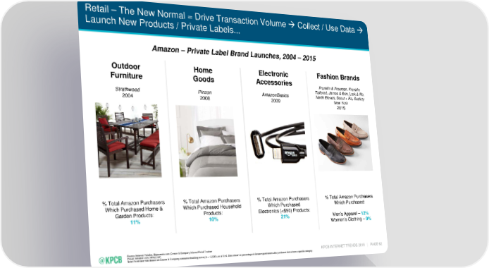 Retail – The New Normal = Drive Transaction Volume Collect / Use Data Launch New Products / Private Labels... Amazon – Private Label Brand Launches, 2004 – 2015 Outdoor Home Electronic Fashion Brands Furniture Goods Accessories Franklin & Freeman, Franklin Strathwood Pinzon AmazonBasics Tailored, James & Erin, Lark & Ro, North Eleven, Scout + Ro, Society 2004 2008 2009 New York 2015 % Total Amazon Purchasers % Total Amazon Purchasers % Total Amazon Purchasers % Total Amazon Purchasers Which Purchased Home & Which Purchased Household Which Purchased Which Purchased: Garden Products: Products: Electronics (<$50) Products: 11% 10% 21% Men’s Apparel – 12% Women’s Clothing – 9% Source: Internet Retailer, Bizjournals.com, Cowen & Company Internet Retail Tracker Image: Amazon.com, Milled.com KPCB INTERNET TRENDS 2016 | PAGE 62 Note: Purchaser data based on Cowen & Company consumer tracking survey (n= ~2,500), as of 3/16. Data shown is percentage of Amazon purchasers who purchased items from a specific category.