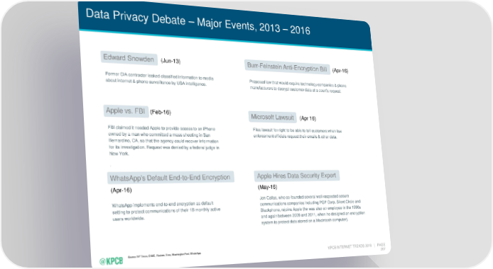 Data Privacy Debate – Major Events, 2013 – 2016 Edward Snowden (Jun-13) Burr-Feinstein Anti-Encryption Bill (Apr-16) Former CIA contractor leaked classified information to media Proposed law that would require technology companies & phone about internet & phone surveillance by USA intelligence. manufacturers to decrypt customer data at a court’s request. Apple vs. FBI (Feb-16) Microsoft Lawsuit (Apr 16) FBI claimed it needed Apple to provide access to an iPhone Files lawsuit for right to be able to tell customers when law owned by a man who committed a mass shooting in San enforcement officials request their emails & other data. Bernardino, CA, so that the agency could recover information for its investigation. Request was denied by a federal judge in New York. . WhatsApp’s Default End-to-End Encryption Apple Hires Data Security Expert (Apr-16) (May-16) WhatsApp implements end-to-end encryption as default Jon Callas, who co-founded several well-respected secure setting to protect communications of their 1B monthly active communications companies including PGP Corp, Silent Circle and users worldwide. Blackphone, rejoins Apple (he was also an employee in the 1990s and again between 2009 and 2011, when he designed an encryption system to protect data stored on a Macintosh computer). Source: NY Times, CNBC, Reuters, Time, Washington Post, WhatsApp. KPCB INTERNET TRENDS 2016 | PAGE 207