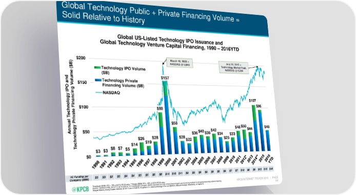 Global Technology Public + Private Financing Volume = Solid Relative to History Global US-Listed Technology IPO Issuance and Global Technology Venture Capital Financing, 1990 – 2016YTD $200 March 10, 2000 = July 20, 2015 = ) NASDAQ @ 5,049 Technology Market Peak, B NASDAQ @ 5,219 $ Technology IPO Volume ( e ($B) nd um Technology Private $157 a ol $150 O V Financing Volume ($B) P I ng i NASDAQ ogy nc $107 na $96 Fi $100 hnol $89 e c t e a T v i l r P $58 $50 $48 nnua ogy $50 $42 $48 $44 A $40 $28 $28 $36 $36 $34 $33 hnol $26 $22 $25 c $19 e $14 T $3 $3 $8 $7 $5 $0 VC Funding per $3 $3 $2 $5 $4 $4 $5 $5 $6 $8 $14 $18 $11 $8 $8 $9 $8 $9 $8 $9 $7 $7 $10 $8 $9 $13 $15 $16 Company ($MM) *Facebook ($16B IPO) = 75% of 2012 IPO $ value. **Alibaba ($25B IPO) = 69% of 2014 IPO $ value. Source: Thomson ONE, 2016YTD as of 5/26/16. VC Funding per Company ($MM) calculated as total venture financing per year divided by number of companies receiving venture financing. KPCB INTERNET TRENDS 2016 | PAGE Morgan Stanley Equity Capital Markets, 2016YTD as of 5/26/16. All global U.S.-listed technology IPOs over $30MM, data per Dealogic, Bloomberg, & Capital IQ. 191