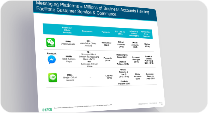 Messaging Platforms = Millions of Business Accounts Helping Facilitate Customer Service & Commerce... Business / B2C Chat for Advertising Partnerships / Official Engagement Payments SMEs (Within Other Accounts Messengers) Services 10MM+ ~80% WeChat Pay Official Official Weidian Official Accounts Users Follow Official (2013) Accounts Accounts (2014) Accounts (2012) (2012) 1B+ Facebook Messages / Month Messaging via Shopify & 50MM+ Between Businesses and Payments Pages (2011) Sponsored Zendesk Small Business Users, +2x Y/Y (2015) Messages Partnership Pages 80% Chatbots (2016) (2015 / 2016) Businesses Active on Platform (2016) Mobile Official Accounts & 2MM+ Line Pay Line @ Official Commerce / Line@ + Official -- (2014) (2012 / 2015) Accounts Stores on Accounts (2012) Line@ (2016) Chatbots Platform (2016) Source: WeChat, Line, Facebook Messenger, various press releases, “WeChat’s Impact: A Report on WeChat Platform Data,” by Grata (2/15) KPCB INTERNET TRENDS 2016 | PAGE 105