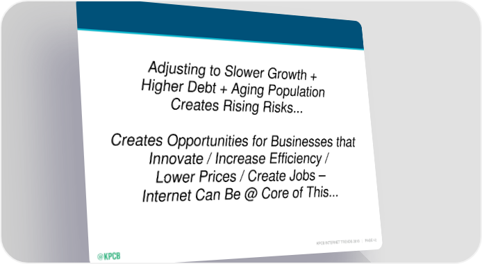 Adjusting to Slower Growth + Higher Debt + Aging Population Creates Rising Risks... Creates Opportunities for Businesses that Innovate / Increase Efficiency / Lower Prices / Create Jobs – Internet Can Be @ Core of This... KPCB INTERNET TRENDS 2016 | PAGE 40