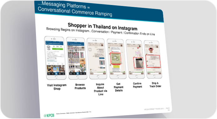 ...Messaging Platforms = Conversational Commerce Ramping Shopper in Thailand on Instagram Browsing Begins on Instagram...Conversation / Payment / Confirmation Ends on Line Visit Instagram Browse Inquire Get Confirm Ship & Shop Products About Payment Payment Track Order Product via Details Line Source: Commerce + Mobile: Evolution of New Business Models in SEA, 7/15. KPCB INTERNET TRENDS 2016 | PAGE 106