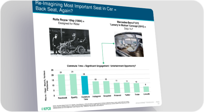 Re-Imagining Most Important Seat in Car = Back Seat, Again? Rolls Royce 10hp (1904) = Mercedes-Benz F 015 Designed for Rider ‘Luxury in Motion’ Concept (2015) = Déjà Vu? Commute Time = Significant Engagement / Entertainment Opportunity? 25 s 21 u 21 o i 19 r 20 a V , 15 13 13 th s n m 11 11 o r 10 M 10 / tfo a 6 r l e P s 5 U / s r 0 u o Facebook Spotify Commute Instagram Snapchat Pinterest Twitter Tinder LinkedIn H Time Source: Time Spent data per Cowen & Co. Research + SurveyMonkey (n = 2,059, 6/15, minutes / day spent across all cohorts and extrapolated to hours / month), except for Spotify (per Company). Commute data per US Census Bureau as of 2013; includes all modes of transportation apart from walking / biking. Assumes 25.9 minute one-way commute, assumed to be 5 days per week in both commute directions and 4.35 average weeks / month. Images per RREC / SWNS.com, Mercedes-Benz, carbodydesign.com KPCB INTERNET TRENDS 2016 | PAGE 157