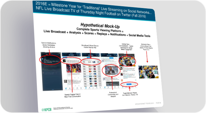 2016E = Milestone Year for ‘Traditional’ Live Streaming on Social Networks... NFL Live Broadcast TV of Thursday Night Football on Twitter (Fall 2016) Hypothetical Mock-Up Complete Sports Viewing Platform = Live Broadcast + Analysis + Scores + Replays + Notifications + Social Media Tools Vertical View = Horizontal View = Tune-In Notifications, Scoreboard Allows Fans to Live Broadcast + Tweets Unencumbered, Full- Game Reminders, Follow Play-by-Play Dashboard for Social Screen, TV-like Viewing Breaking Actions Media Engagement Experience Tweets Engage Fans in Professional Toggle Between Tweets Real-Time Conversation Commentary and from Stadium / Nearby / All Analysis Source: KPCB Hypothetical Mock-Up. Design provided by Brian Tran (KPCB Edge) KPCB INTERNET TRENDS 2016 | PAGE 88