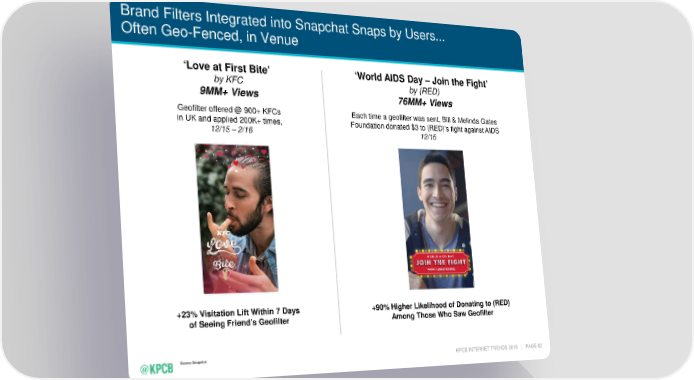 Brand Filters Integrated into Snapchat Snaps by Users... Often Geo-Fenced, in Venue ‘Love at First Bite’ ‘World AIDS Day – Join the Fight’ by KFC by (RED) 9MM+ Views 76MM+ Views Geofilter offered @ 900+ KFCs Each time a geofilter was sent, Bill & Melinda Gates in UK and applied 200K+ times, Foundation donated $3 to (RED)’s fight against AIDS 12/15 – 2/16 12/15 +23% Visitation Lift Within 7 Days +90% Higher Likelihood of Donating to (RED) of Seeing Friend’s Geofilter Among Those Who Saw Geofilter Source: Snapchat KPCB INTERNET TRENDS 2016 | PAGE 82