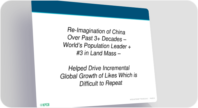 Re-Imagination of China Over Past 3+ Decades – World’s Population Leader + #3 in Land Mass – Helped Drive Incremental Global Growth of Likes Which is Difficult to Repeat KPCB INTERNET TRENDS 2016 | PAGE 26