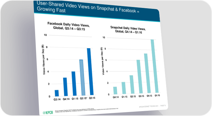User-Shared Video Views on Snapchat & Facebook = Growing Fast Facebook Daily Video Views, Snapchat Daily Video Views, Global, Q3:14 – Q3:15 Global, Q4:14 – Q1:16 10 10 ) ) B 8 B 8 ( ( ay D ay er D p er s 6 p 6 s ew i ew V i eo V d 4 eo 4 i d V i V 2 2 0 0 Q3:14 Q4:14 Q1:15 Q2:15* Q3:15 Q4:14 Q1:15 Q2:15 Q3:15 Q4:15 Q1:16 Source: Facebook, Snapchat. Q2:15 Facebook video views data based on KPCB estimate. Facebook video views represent any video shown onscreen for >3 seconds (including autoplay). Snapchat video views counted instantaneously on load. KPCB INTERNET TRENDS 2016 | PAGE 78