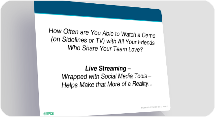How Often are You Able to Watch a Game (on Sidelines or TV) with All Your Friends Who Share Your Team Love? Live Streaming – Wrapped with Social Media Tools – Helps Make that More of a Reality... KPCB INTERNET TRENDS 2016 | PAGE 87