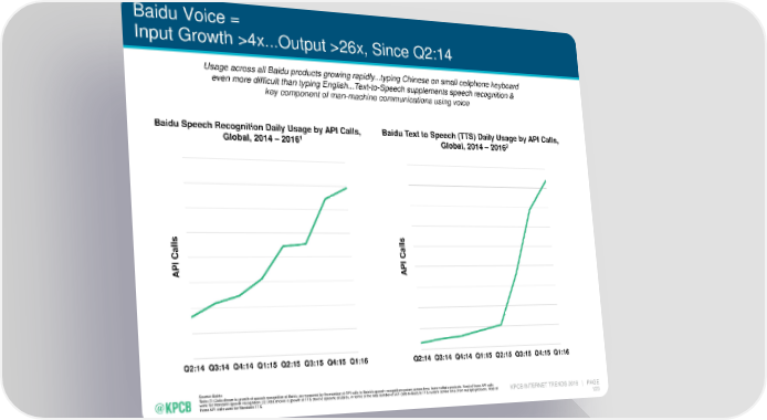 Baidu Voice = Input Growth >4x...Output >26x, Since Q2:14 Usage across all Baidu products growing rapidly...typing Chinese on small cellphone keyboard even more difficult than typing English...Text-to-Speech supplements speech recognition & key component of man-machine communications using voice Baidu Speech Recognition Daily Usage by API Calls, Baidu Text to Speech (TTS) Daily Usage by API Calls, 1 2 Global, 2014 – 2016 Global, 2014 – 2016 lls lls a a I C I C P P A A Q2:14 Q3:14 Q4:14 Q1:15 Q2:15 Q3:15 Q4:15 Q1:16 Q2:14 Q3:14 Q4:14 Q1:15 Q2:15 Q3:15 Q4:15 Q1:16 Source: Baidu Note: (1) Data shown is growth of speech recognition at Baidu, as measured by the number of API calls to Baidu's speech recognition system across time, from multiple products. Most of these API calls were for Mandarin speech recognition. (2) Data shown is growth of TTS (text to speech) at Baidu, in terms of the total number of API calls to Baidu's TTS system across time, from multiple products. Most of KPCB INTERNET TRENDS 2016 | PAGE these API calls were for Mandarin TTS. 123
