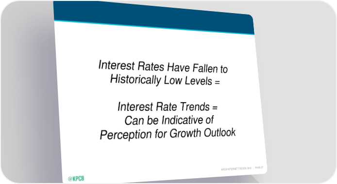 Mary Meeker's Annual Internet Trends Report Page 27 Page 29Interest Rates Have Fallen to Historically Low Levels = Interest Rate Trends = Can be Indicative of Perception for Growth Outlook KPCB INTERNET TRENDS 2016 | PAGE 27