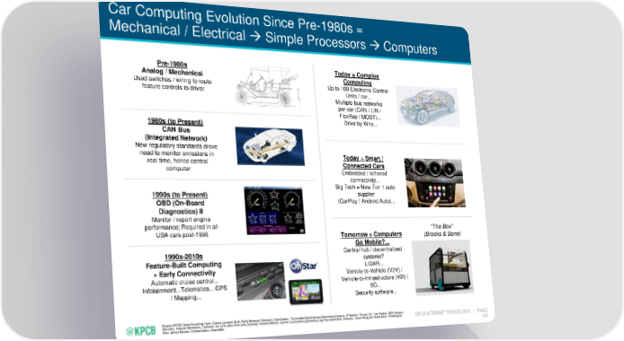 Car Computing Evolution Since Pre-1980s = Mechanical / Electrical Simple Processors Computers Pre-1980s Today = Complex Analog / Mechanical Computing Used switches / wiring to route Up to 100 Electronic Control feature controls to driver Units / car... Multiple bus networks per car (CAN / LIN / FlexRay / MOST)... 1980s (to Present) Drive by Wire... CAN Bus (Integrated Network) New regulatory standards drove need to monitor emissions in Today = Smart / real time, hence central Connected Cars computer Embedded / tethered connectivity... Big Tech = New Tier 1 auto 1990s (to Present) supplier OBD (On-Board (CarPlay / Android Auto)... Diagnostics) II Monitor / report engine performance; Required in all “The Box” USA cars post-1996 Tomorrow = Computers (Brooks & Bone) Go Mobile?... 1990s-2010s Central hub / decentralized Feature-Built Computing systems? + Early Connectivity LIDAR... Automatic cruise control... Vehicle-to-Vehicle (V2V) / Infotainment...Telematics... GPS Vehicle-to-Infrastructure (V2I) / / Mapping... 5G... Security software... rd Source: KPCB Green Investing Team, Darren Liccardo (DJI); Reilly Brennan (Stanford); Tom Denton, “Automobile Electrical and Electronics Systems, 3 Edition,” Oxford, UK: Tom Denton, 2004; Samuel DaCosta, Popular Mechanics, Techmor, US EPA, Elec-Intro.com, Autoweb, General Motors, Garmin, Evaluation Engineering, Digi-Key Electronics, Renesas, Jason Aldag and Jhaan Elker / Washington KPCB INTERNET TRENDS 2016 | PAGE Post, James Brooks / Richard Bone, Shareable 138