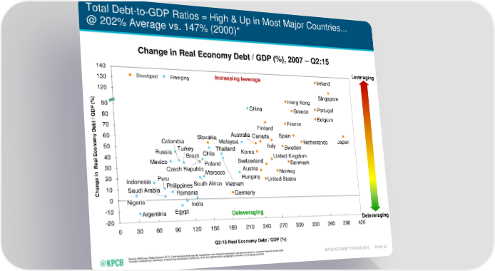 Total Debt-to-GDP Ratios = High & Up in Most Major Countries... @ 202% Average vs. 147% (2000)* Change in Real Economy Debt / GDP (%), 2007 – Q2:15 140 Leveraging 130 Developed Emerging Increasing leverage Ireland 120 Singapore Hong Kong ) (% 90 China Greece Portugal P D 80 Belgium G France t / b 70 Finland e D Australia Canada Spain y 60 Slovakia m Colombia Malaysia Netherlands Japan o Italy n 50 Turkey Thailand Sweden o c Russia Brazil Chile Korea United Kingdom E 40 l a Mexico Switzerland Denmark e 30 Poland R Czech Republic Austria Norway n Morocco i Hungary e 20 Peru United States g Indonesia n South Africa Vietnam a 10 Philippines h Saudi Arabia Romania C Germany 0 Nigeria India -10 Argentina Egypt Deleveraging -20 Deleveraging 0 30 60 90 120 150 180 210 240 270 300 330 360 390 420 Q2:15 Real Economy Debt / GDP (%) Source: McKinsey Global Institute (3/16). Debt includes that owed by households, non-financial corporates, and governments (i.e. excludes financial sector debt). *Country inclusion per McKinsey; includes top developed countries by GDP and representative geographic selection of emerging countries. KPCB INTERNET TRENDS 2016 | PAGE 32